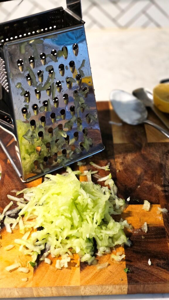 - Grated Cucumber: Cucumber adds coolness, hydration, and that signature crisp, refreshing flavor. Removing the seeds and draining excess water keeps the sauce thick rather than watery. Cucumbers provide antioxidants, hydration, and trace minerals—all in a light, subtly sweet package.