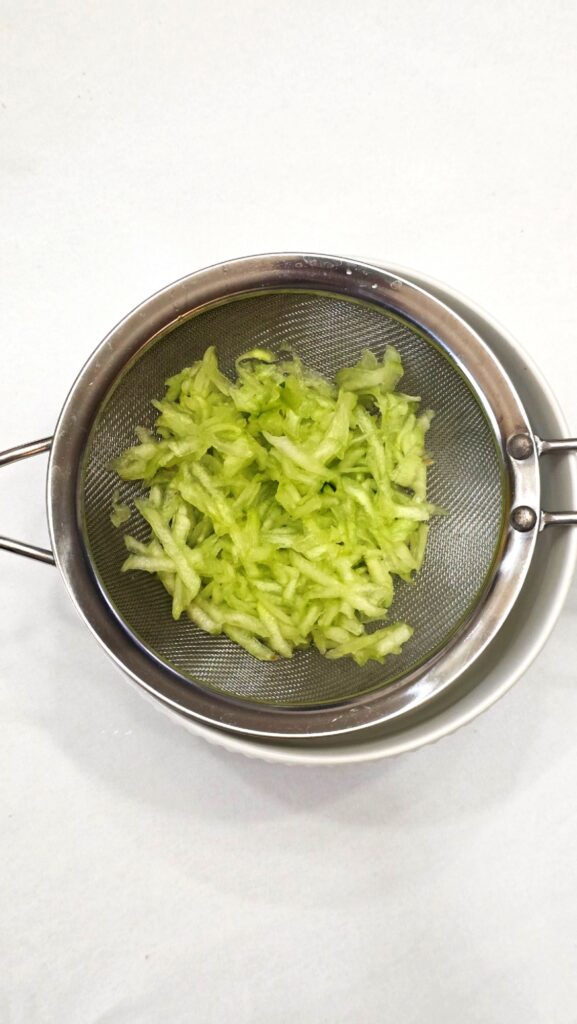 - Begin by grating the cucumber after it has been peeled and seeded. Place the cucumber shreds in a strainer and sprinkle with a little salt. Allow the cucumber to drain for at least 10-15 minutes to remove excess water. You can also use the back of a spoon to press the shreds to remove additional water.