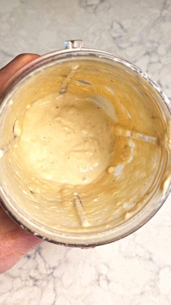 • Once the cashews have soaked, add the cashews with 1-2 tbsp of the water they have soaked in to a blender cup. Blend until the cashews have a smooth and consistent texture.